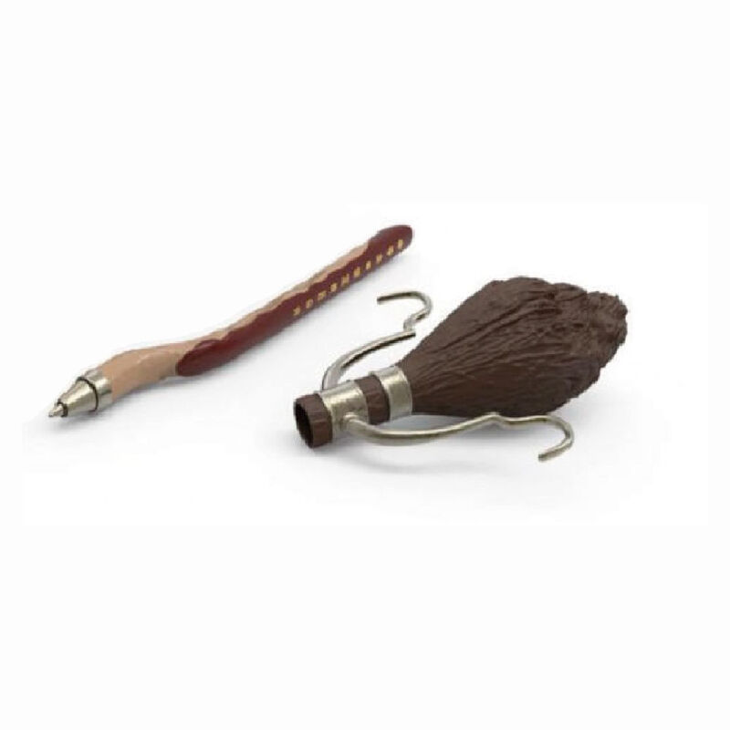 Este bolígrafo es un artículo único y original, que combina un diseño mágico con una función práctica. Está formado por una escoba de metal, con un cartucho de tinta extra, que se sostiene en el aire gracias a un imán. El bolígrafo viene con una peana de plástico, con el logo de Harry Potter, que sirve de base para la escoba.