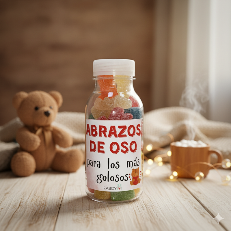 Dentro de esta coqueta botellita te esperan las más tiernas **gominolas de fruta** azucaradas, listas para endulzar cualquier momento. Con sus vivos colores y textura jugosa, estas chuches son la medicina infalible contra los días grises. Olvídate de las tristezas y regala un gesto de amor con estos deliciosos **Abrazos de Oso**. ¡Consigue hoy mismo tu dosis de felicidad garantizada y haz que el día sea inolvidablemente dulce!