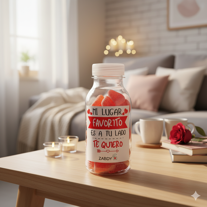 La botella es un envase premium reutilizable que lleva impreso un mensaje cargado de ternura: "Mi lugar favorito es a tu lado". Su contenido, cuidadosamente seleccionado por **Candy Pop**, asegura una explosión de sabor a fruta que enamora al primer mordisco. Olvídate de regalos aburridos; esta botellita es un **detalle genuino**, lleno de dulzura y sentimiento. ¡Haz que el amor sea la excusa perfecta para endulzar vuestro día!