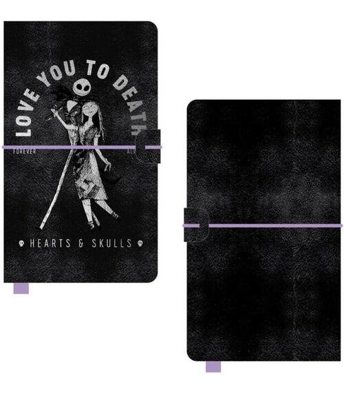 Su diseño en color negro presenta la icónica frase 'LOVE YOU TO DEATH' junto a Jack y Sally, con el detalle 'HEARTS & SKULLS' que le otorga un toque único y misterioso. Ideal para tomar notas, dibujar o simplemente como un elegante objeto de merchandising original de Disney.