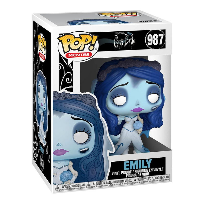 Este Funko Pop es un producto oficial de la marca Funko, realizado en vinilo y con un tamaño de 9 cm y muestra a Emily con su vestido azul desgarrado y sus ojos brillantes, luciendo su anillo de compromiso.