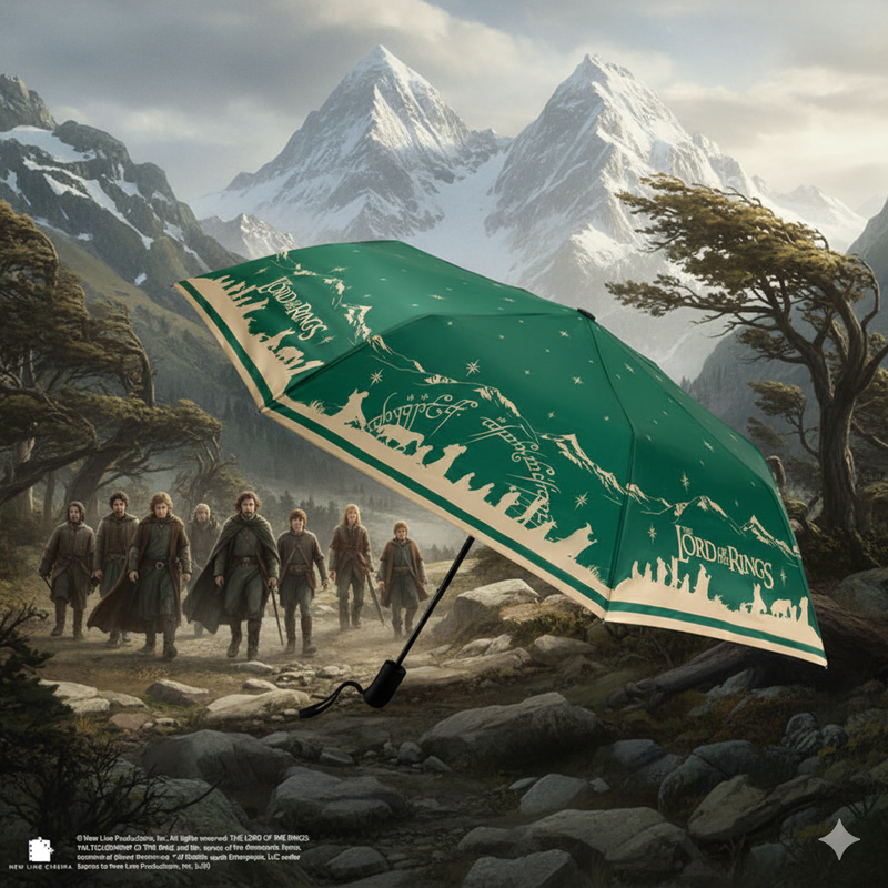 Su diseño plegable y ligero te permite llevarlo a cualquier parte, desde La Comarca hasta los pies del Monte del Destino. El vibrante color verde bosque y las siluetas en beige representan la icónica marcha de nuestros héroes, con detalles sutiles de la cartografía de la saga y el logo de El Señor de los Anillos. Es el regalo perfecto de merchandising friki para cualquier fanático. ¡No dejes que el mal tiempo te detenga en tu aventura!