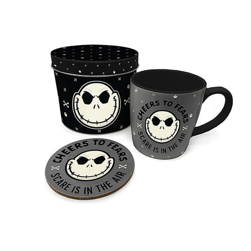 Este set incluye una taza de cerámica, un posavasos a juego y una lata metálica decorativa. Cada pieza luce diseños de Pesadilla Antes de Navidad, con la imagen de Jack y la frase "Cheers to Fears, Scare is in the Air". Es el merchandising oficial Disney que no puede faltar en tu colección.